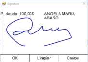 Ahora el cliente podrá firmar en el dispositivo pudiendo proceder a la cancelación, a limpiar la pantalla si no está conforme con su firma o bien pulsando con el lápiz sobre el botón OK para ya desencadenar el cierre del documento.