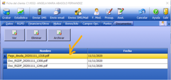 Estos documentos son consultables en la pestaña DOCUMENTOS de la Ficha del Cliente y pueden visionarse cuando se desee seleccionando el documento y pulsando sobre el botón VER.