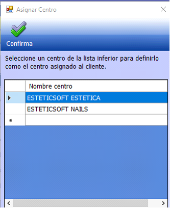 Al ir a dar de alta un nuevo cliente, una vez rellenados sus datos y pulsando el botón GRABAR aparece la siguiente ventana para elegir el centro de referencia asignado a este cliente seleccionando el centro y pulsando el botón CONFIRMAR.