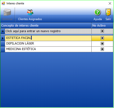 Se ha añadido, en la ficha de Cliente, un nuevo campo en el que indicar cuál es el Interés del Cliente en los servicios o productos del centro.