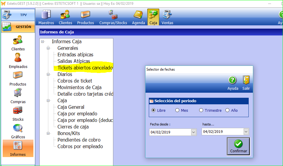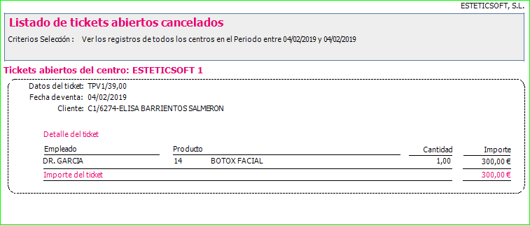 El control de los tickets cancelados se efectúa en GESTIÓN - INFORMES - CAJA - GENERALES - TICKETS ABIERTOS CANCELADOS