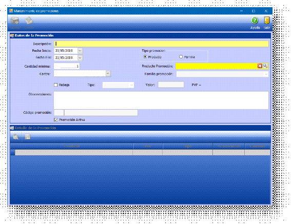 En ella señalaremos el nombre de la promoción, las fechas de inicio y final de validez de dicha oferta, el producto/servicio sobre el que aplicamos la promoción y la cantidad necesaria del producto promocionado.