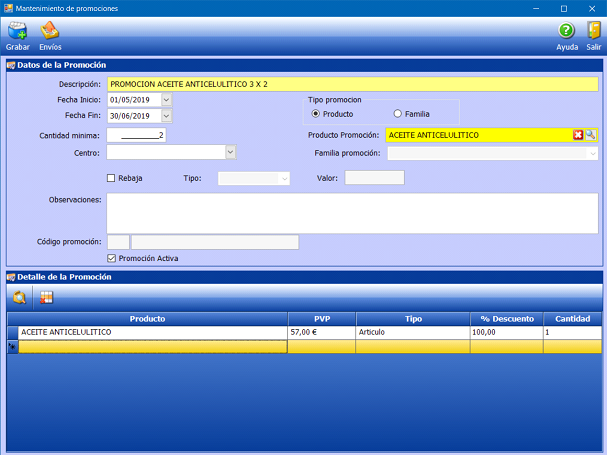 Se promociona la compra de dos unidades de un producto, datos indicados en la parte superior de la ventana, regalando (descuento 100%) una unidad del mismo producto, datos reflejados en la parte inferior de la ventana.