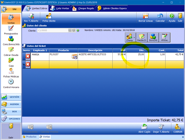 Hemos activado la casilla FAMILIA y elegido el tipo IMPORTE con el valor 5, cuando procedemos a la venta